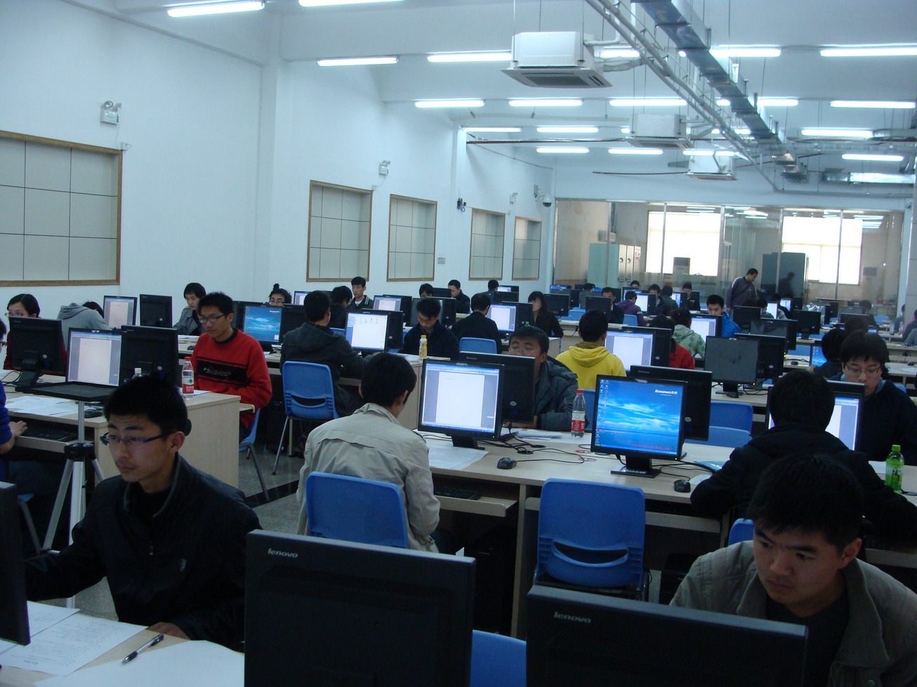 上机考试于4月8日下午在信息开元(中国)教学实验中心和院研究生实训基地同时进行,在宽敞明亮的大厅里,考生们坐在一排排整齐的电脑前认真地解答着试题,现场响起了一片轻轻的噼里啪拉的敲击键盘声,气氛紧张而有序。