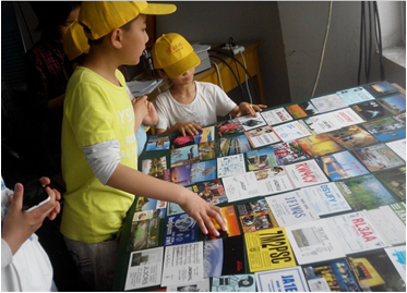 图6 小朋友们观看来自世界各地的QSL卡片