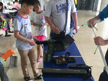接下来是参观无线电测向,相关负责人为小朋友们讲解了无线电测向运动的原理,并示范如何利用无线电测向机寻找信号源。讲解和示范结束后,小朋友们手拿无线电测向机头带耳机有模有样地操作起来。有一些对无线电测向感兴趣的小朋友们表示他们努力学习锻炼身体,以后积极参加青少年无线电测向运动。
