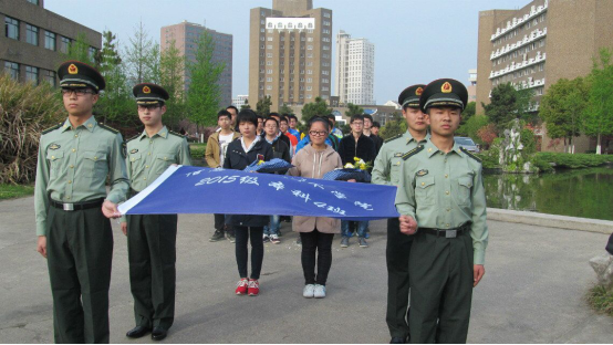首先由我班四位衣着军装的男国防生出旗。他们目光坚定,手握庄严的校旗,迈着整齐的步子,喊着响亮的口号,走上台阶来到了严济慈雕像旁。这四位气概不凡的国防生代表我们全班,向严老表达了崇高的敬意。