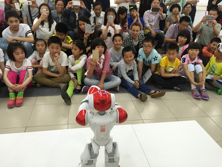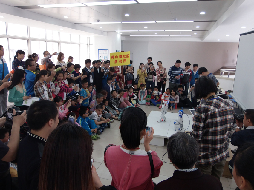 机器人表演吸引了大量参观者,排队的长龙达到几百人,场地四周围满了热情的观众。仿人智能机器人表演了多种项目:中国武术、流行歌曲、劲爆舞蹈等,今年还增加了西游记故事等新节目,特别受到小朋友们的喜欢,精彩的表演赢得了现场阵阵欢呼声和掌声。