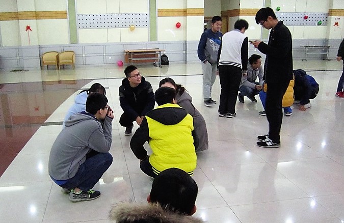 接着,是五人一组,在指定数目的瓷砖上完成规定动作的游戏。开始难度还是简单模式,渐渐地,随着要求越来越高,大家的动作也越来越有趣:又坐在地上抱紧双腿的,有跪在地上脚尖翘起的,在欢声笑语中完成了游戏。