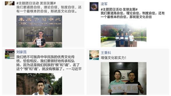 信院1401班在9月13日开展社会主义核心价值观、文化自信主题班会活动后,从9月13日到9月20日期间,同学们积极发表自己对社会主义核心价值观和文化自信的理解,并积极展示学习风采,同学们通过拍照留影,将照片发到微信朋友圈或QQ空间的方式传播正能量。