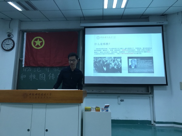 当天早上,汤亚宁首先讲述了邪教的定义:邪教是以宗教为美化面纱的蛊惑人心、危害社会的非法组织。邪教首先会神化其首领,并给其信众洗脑。最后传播不当、不利于甚至是危害社会发展与国家治安的言论。