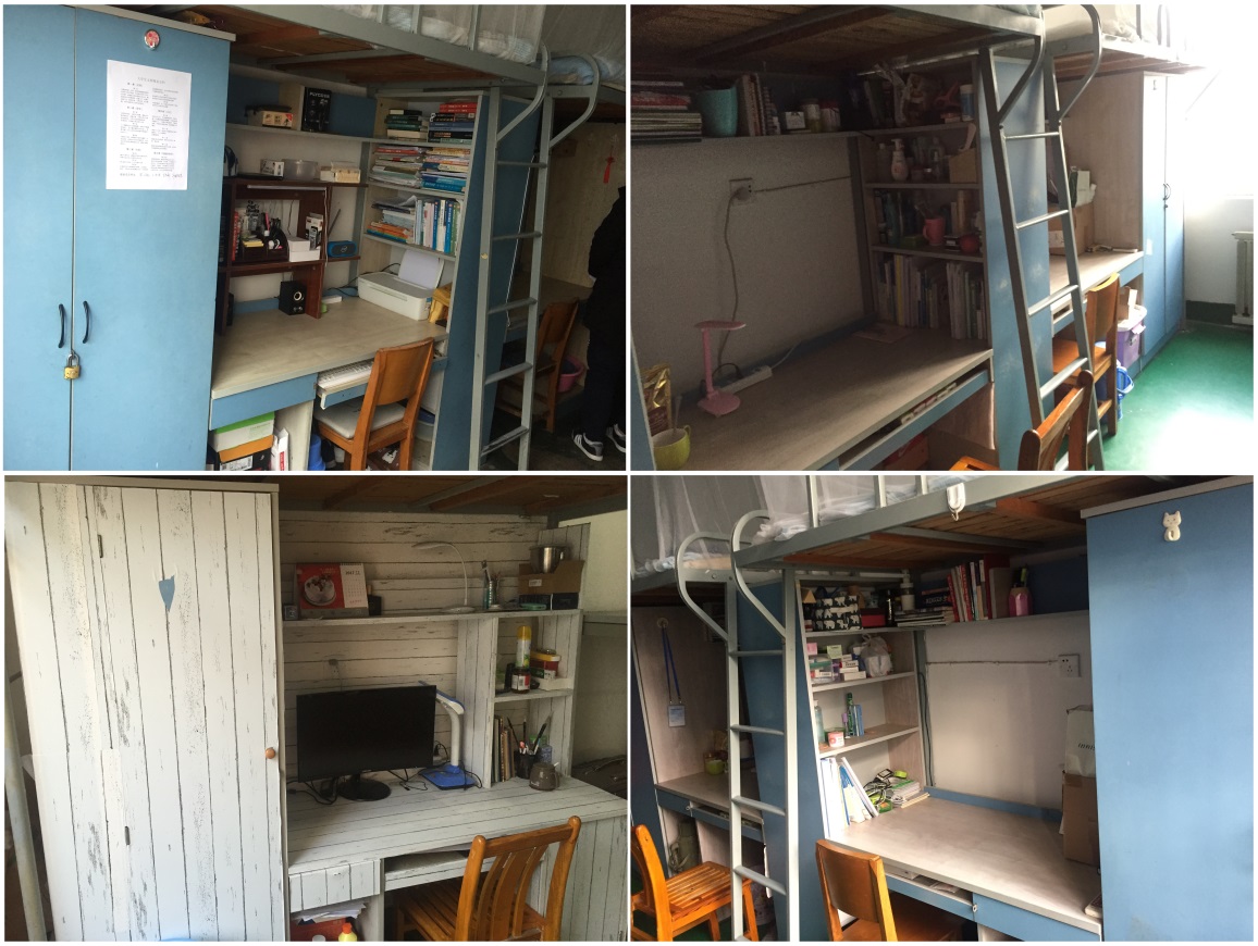 1.悬挂物:寝室窗户、柜体外侧、床栏杆、门上、寝室正上方等位置,无任何悬挂物如衣服毛巾等;(共10分)