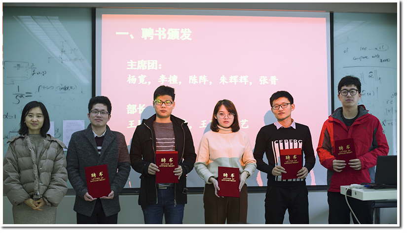 首先进行的是颁发聘书,经过三个月的实际考核,主席团以及部长通过了考核,荣获聘书。名单为:主席团:杨宽,李檀,陈阵,朱辉辉,张晋;部长:王国霖,严炜,王丽,吕艺。