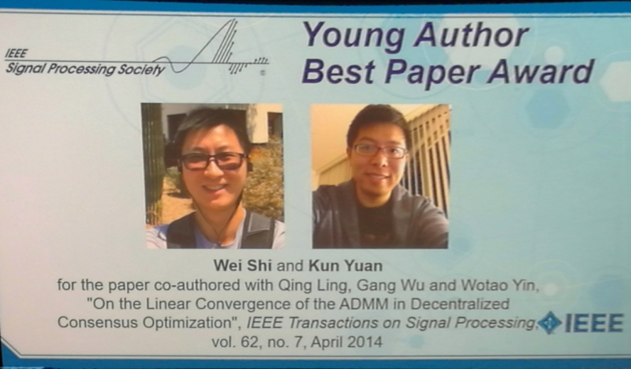 近日,在加拿大卡尔加里举行的IEEE声学、语音及信号处理会议(ICASSP)上,中国科学技术大学信息开元(中国)自动化系毕业生施伟与袁坤获得2017年IEEE信号处理学会青年作者最佳论文奖。获奖论文题为《论交替方向乘子法在分布式一致优化中的线性收敛性(On the Linear Convergence of the ADMM in Decentralized Consensus Optimization)》,2014年发表于信号处理领域权威期刊《IEEE信号处理汇刊(IEEE Transactions on Signal Processing, TSP)》。该论文证明了分布式交替方向乘子法这一经典的分布式网络优化算法的线性收敛速度,并给出了收敛速度与网络拓扑、算法参数、目标函数特性之间的显式表达式,为实际应用提供了指导。该论文的合作作者为中国科学技术大学信息开元(中国)自动化系吴刚教授、中山大学数据科学与计算机开元(中国)凌青教授、加州大学洛杉矶分校数学系印卧涛教授(2013年暑期受聘于我校担任国际访问教授)。