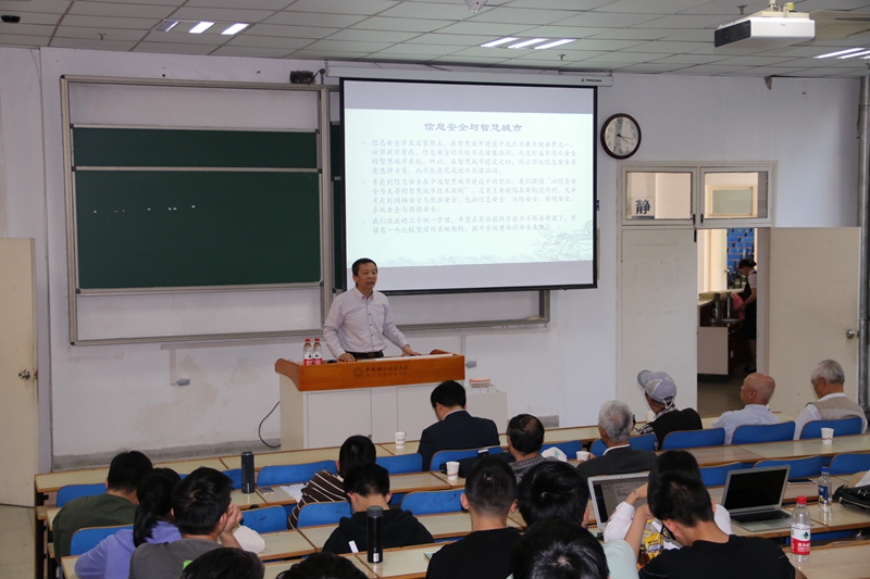 接下来,在西区3C104教室,两位学术界和实业界的资深校友为到场的师生们带来了精彩的学术讲座。首先由高学明博士作题为《中国智慧城市建设的问题在哪里?》的专题报告,他为大家介绍了智慧城市应该有的系统架构与建设方向,并提出了以信息安全为主导的智慧城市系统到底应该如何架构这一既很严肃又很迫切的问题,他的精彩发言引起了到场师生们的高度共鸣。