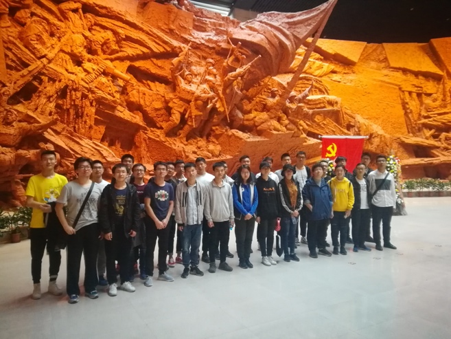 下午一点左右,全体同学乘坐大巴车来到渡江战役纪念馆。纪念馆门前屹立着渡江战役的五位指挥人员的雕像。在伟人巨大的雕像前,同学们不禁被伟人们的风范所感染。持着红色的团旗,同学们在雕像前合影留念。纪念馆的入口由环绕的水池和一座铁桥组成。铁灰色的桥在冷冷的波光前,散发着浓厚的庄严感。同学们跟随人群静静地穿过桥梁。没有嘻嘻哈哈、交头接耳,有的只是沉默和肃静。
