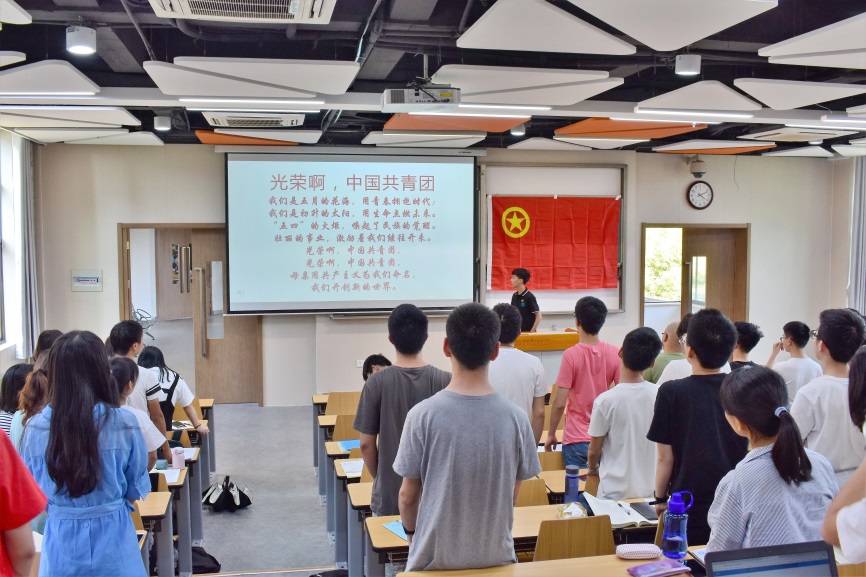 听完周俊亦同学简短的经验分享之后,团支书徐诚超同学主持开始本学期的第二次团课。首先,团支书让全体师生起立,奏唱团歌《光荣啊,中国共青团》。在伴奏声的旋律中,大家饱含激情,精神振奋地唱了起来,那一字一句,仿佛印在心间。“我们是五月的花海,用青春拥抱时代……”,这富有诗意和激情的歌词,无不印证每一个人朝气蓬勃的青春。