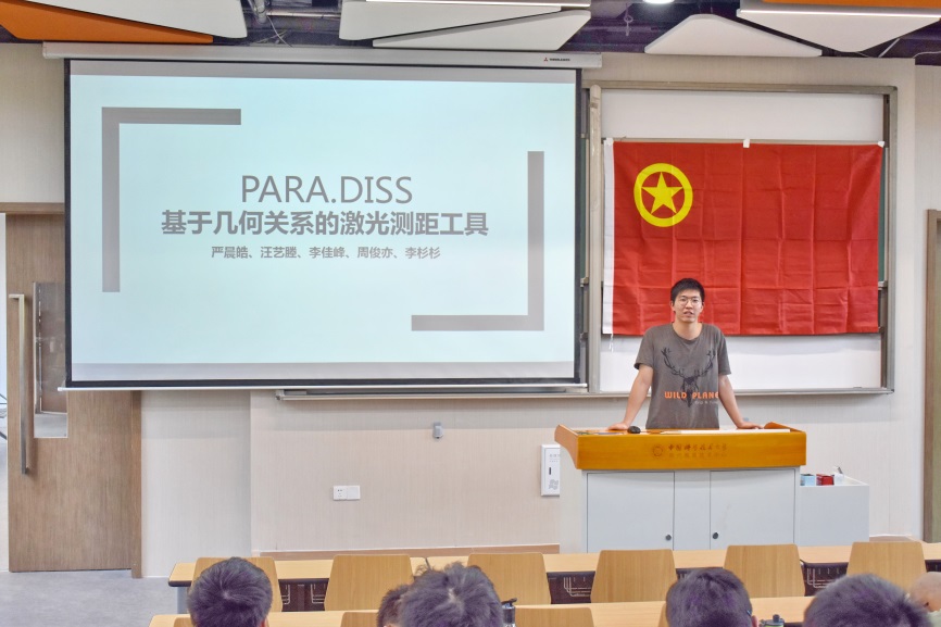 在团课之前,本班周俊亦同学分享了上个学期他在《电子设计实验二》中,他与小组成员共同完成的作品——PARA.DISS(基于几何关系的激光测距工具)。首先他从设计这个作品的灵感来源说起,接着介绍了完成这个激光测距工具需要用到的硬件核心器件、软件的设计,同时他还谈到了在设计过程中遇到的困难以及他们的作品是如何改进的,并达到了测距两米仅有毫米级的误差的测量精度。