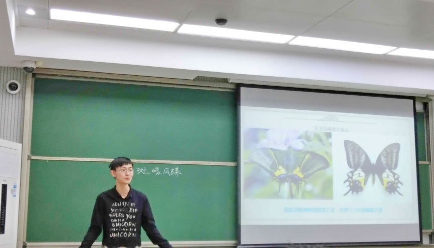 他先是给我们科普了昆虫的分类,并以常见的昆虫“苍蝇”,“蚊子”为例考了考大家,他的口中不乏身着盔甲的“独角仙”以及靠拟态顺应自然的枯叶蝶,并在比较昆虫结构中提出“蚂蚁与蜜蜂是否有共同祖先?”的假说,带领同学积极思考分析。他还大方地向我们展示了他从小收集的昆虫标本,让我们在惊叹的同时感受到昆虫世界的多彩。