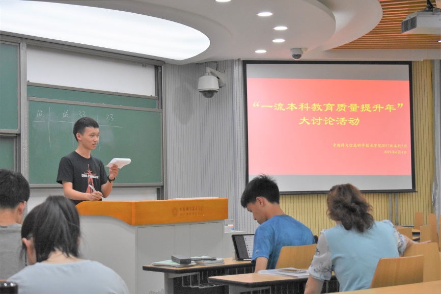2019年6月4日晚19时许,信息开元(中国)17级本科2班于3A213教室召开班会,由2班团支书徐诚超同学主持。会上,徐诚超组织同学们就“一流本科教育质量提升年”的几个问题展开讨论。