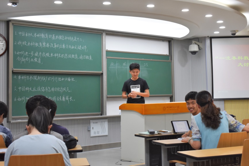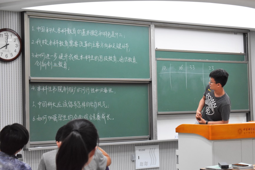 会议伊始,徐诚超同学将六个有关科大教育的议题书写在黑板上,以学习小组为单位,向同学们征集意见与建议。早在班会开始前,徐诚超同学已将六个议题交付学习小组组长,各组长组织开展线上讨论。这样的预讨论充分调动起了同学们的想法,加快了会上讨论的进程,同学们各抒己见,完善想法。最后,各个学习小组组长上台汇报讨论结果,提出了若干认识与建议,主要集中于对后四个问题的探讨。