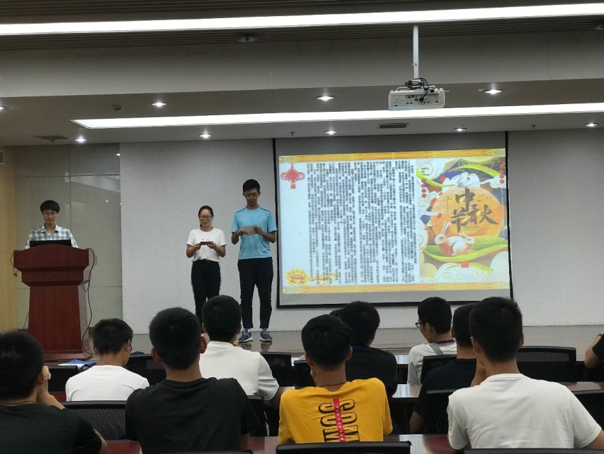 活动由班主任老师提出,五班班委各位同学策划,并在各位同学的帮助下顺利完成。本次活动由两名团委主持,分为转院新同学介绍、同学才艺表演、中秋折纸、自做月饼等四个环节。