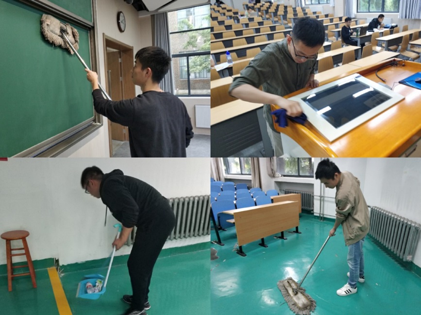 为让同学们在一个干净整洁的环境下学习,本次活动安排为打扫教室卫生、清洁黑板及摆放物品等。同学们集合完毕后,从清洁阿姨处领取了扫帚、拖把、抹布等清洁工具,分组到三教B楼和C楼共5个教室打扫卫生。同学们都情绪高涨,在不打扰自习同学的前提下开始进行打扫,认真地擦黑板、抹桌子、扫地、拖地,每个人都不怕脏、不怕累。