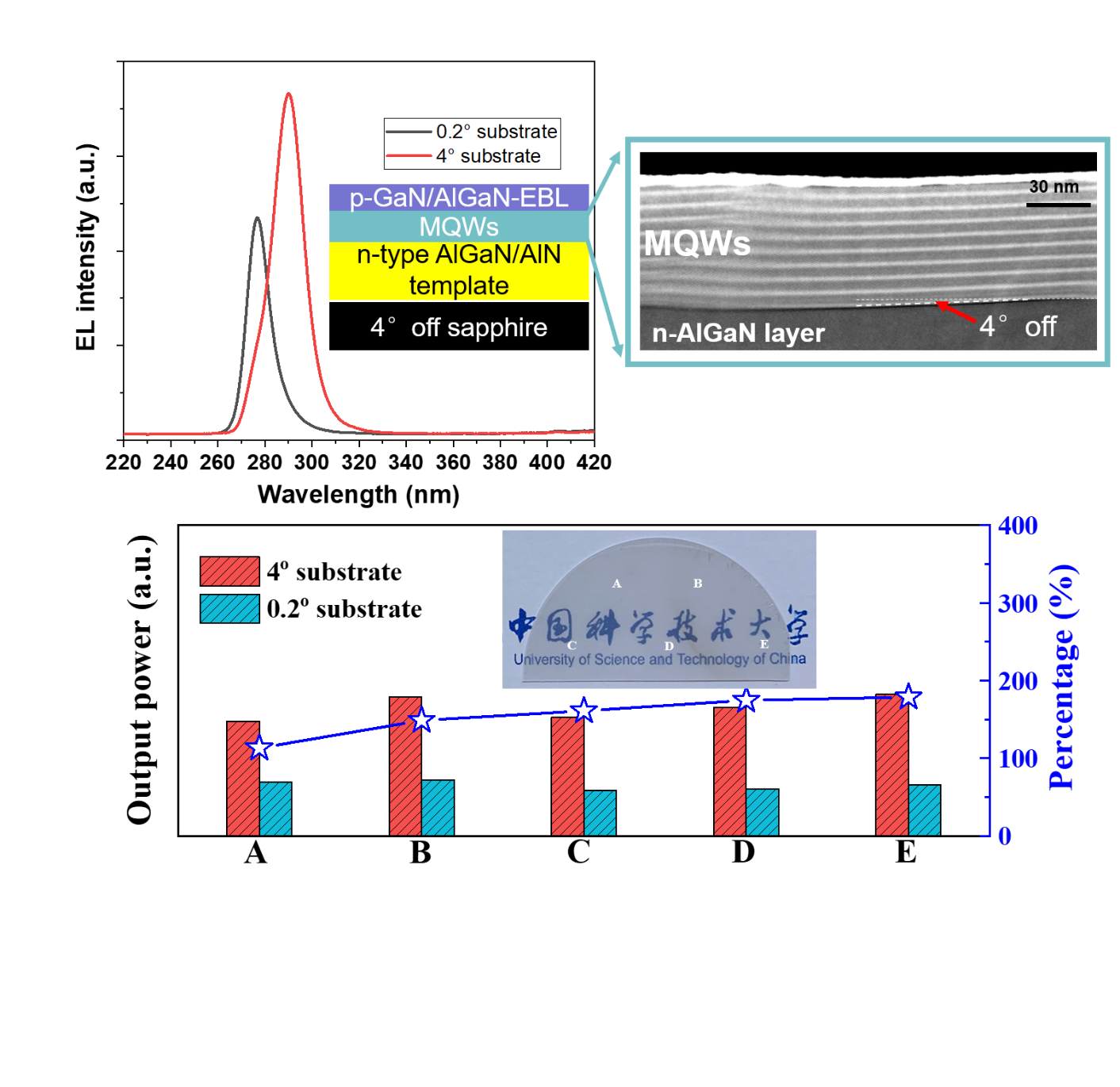 图:在0.2和4度斜切角蓝宝石衬底上制备的深紫外LED光致发光光谱和器件示意图,有源区透射电子显微镜展示了高分辨多量子阱结构图,和输出功率的对比图。