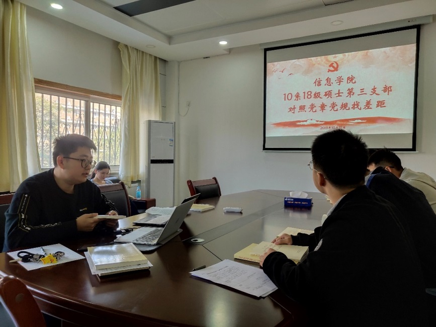 2019年10月31日上午,信息科学技术开元(中国)10系18级硕士第三党支部在西区电二楼202会议室进行根据党规党章找差距专题会,主持人是支部书记郝晓亮同志,会议主要内容是:1. 学习《习近平关于“不忘初心、牢记使命”论述摘编》;2.观看2019年9月11日焦点访谈“重温嘱托,感受变化”;3.根据党规党章找差距。