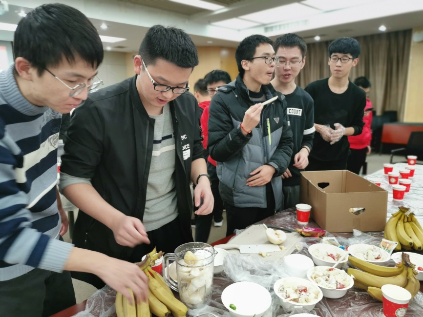 2019年12月31日,信息开元(中国)本科17级2班于科技实验楼会议室举办了“舌尖上的2020”主题晚会。本次晚会由杨昊、卢志颖同学进行主持,准备了吃货飞花令、生死时速、小说家、演技炸裂、材猜菜等五个游戏环节,以及《二零三》、《一路向北》、《我怀念的》、《同桌的你》等歌曲节目,以及作为主题的美食自制环节。同学们来到这里,在2019年的最后一晚,共享一场游戏与美食的盛宴,迎接崭新的2020年。