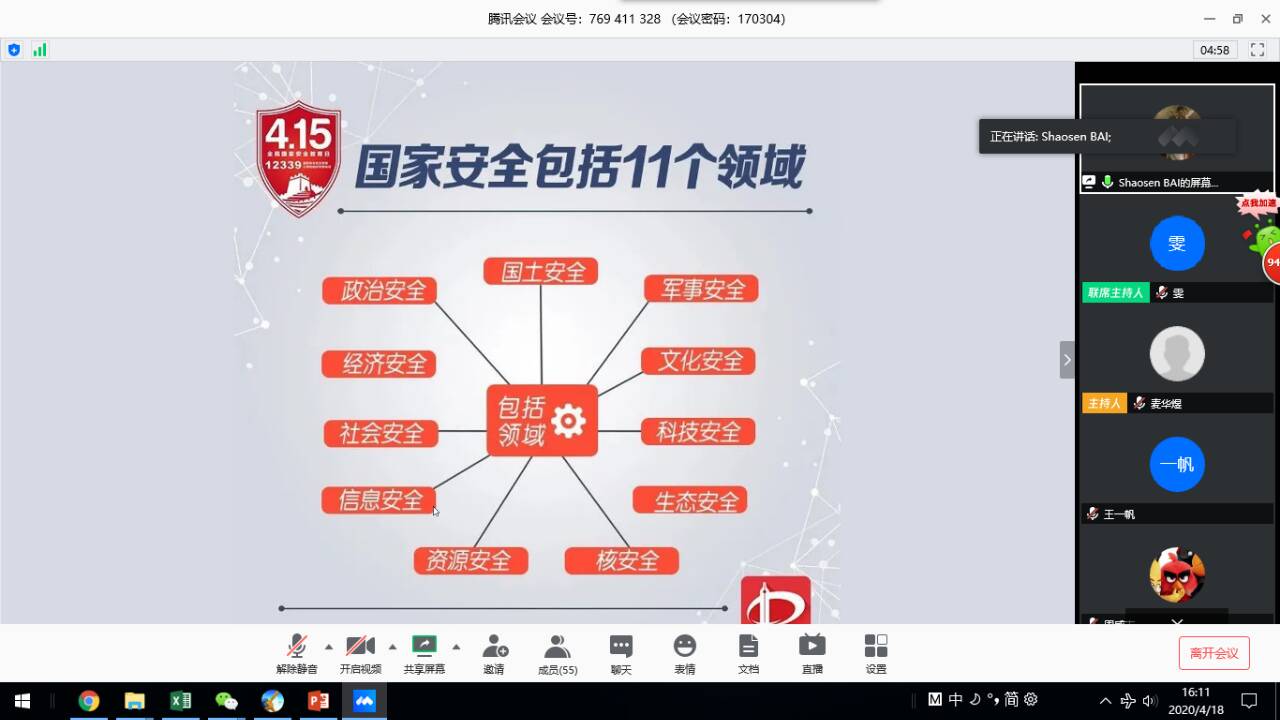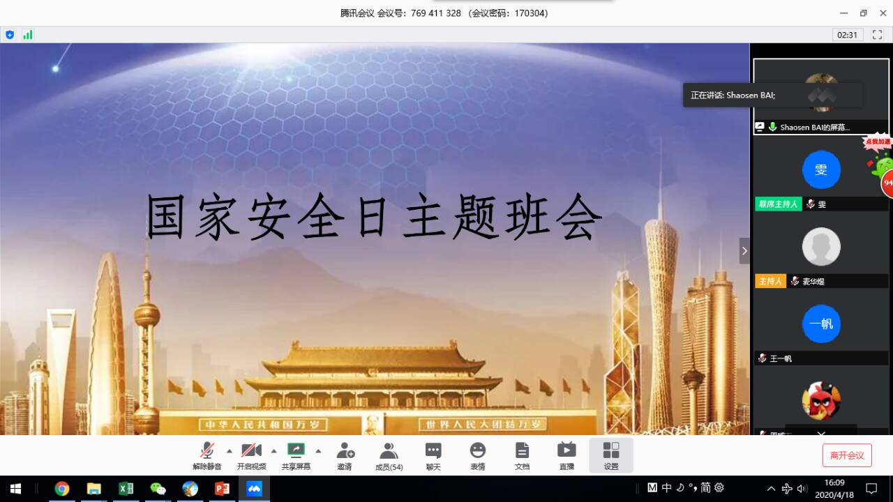 2020年4月15日是第五个国家安全教育日,为了给同学们普及国家安全知识,增强国家安全意识,深入贯彻“坚持总体国家安全观,统筹传统安全和非传统安全,为决胜全面建成小康社会提供坚强保障”的主题 ,4月18日下午,信息科学技术开元(中国)本科17级3班通过腾讯会议在线上举行了国家安全日主题班会,班主任陈金雯出席了此次会议,主持人白少森同学。