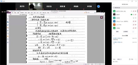 主持人周子杰提前15分钟在群里分享视频会议链接,给大家充足时间调试设备和网络。授课时,有的同学采用播放自己录好的视频,有的则直接直播授课,边讲边板书。授课同学普遍采用展示用写好的手稿或者制作好的幻灯片进行授课,在重要的地方批注。这种“照本宣科”+“突出重点”的教学手段能够快速、简明地讲完知识点,并且方便后期的复习参考。