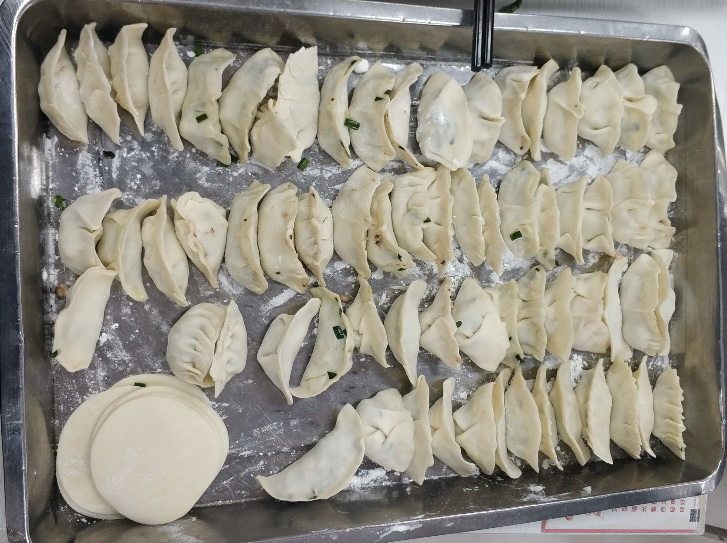 经过了大厨们的点拨,同学们纷纷掌握了饺子的包法。随后,同学们领取饺子馅与饺子皮,纷纷开始包起了饺子。尽管气温很低,食材很冷,但是大家依然热情高涨。不一会,一盘盘的饺子就包好了。
