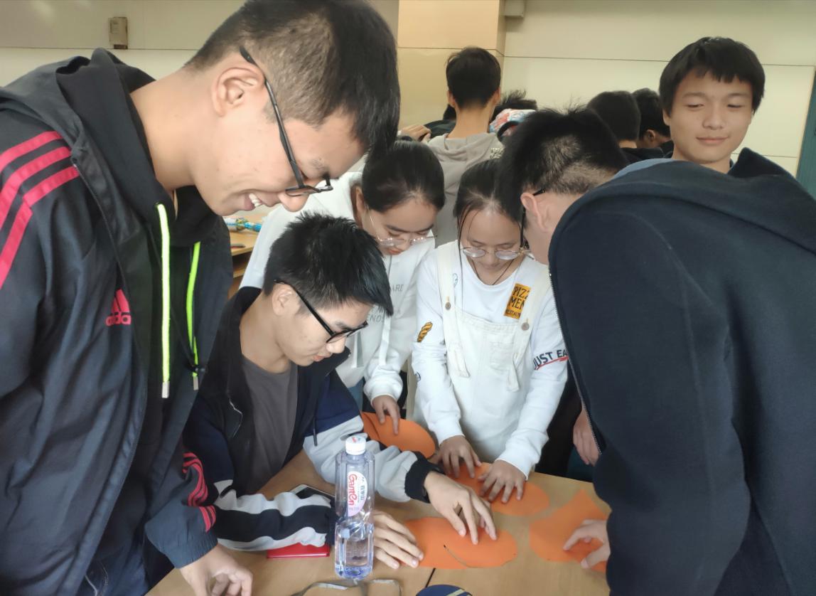 首先由班主任刘老师为大家详细介绍了本次活动的目的、意义、流程及注意事项,使同学们对本次活动有一个大致的了解。接下来,刘老师为大家分发了破冰游戏所需要的道具:颜色各异的被剪成不规则形状的碎纸片,拿到相同颜色的同学需用各自的碎纸片拼成一幅完整的图画。经过十余分钟的辗转、讨论,大家顺利找到了各自的队友。紧接着,大家又用分发的玩具锤玩起了“棒打薄情郎”的游戏,小组内的所有成员需先向大家介绍自己,之后再让每个人说出小组内其他成员的名字,说不上来则会被“棒打”。经过十五分钟的“激烈战斗”,气氛变得十分活跃,大家也立刻熟悉起来。