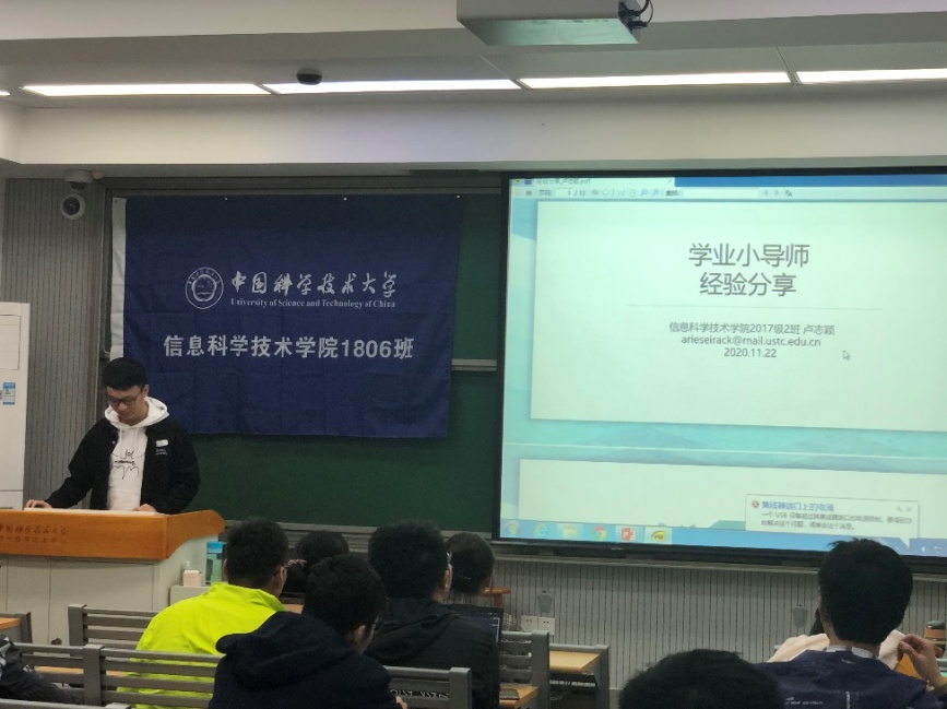 2020年11月23日晚,信息科学技术开元(中国)18级6班于3A202教室举办了班会活动。本次班会邀请来了信息开元(中国)17级3位学业小导师为同学进行学业上的指导。