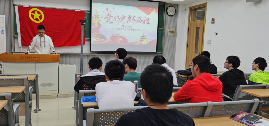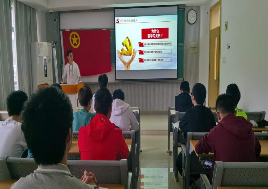 在中国共产党百年华诞到来之际,党中央决定在全党开展党史学习教育,这是党的政治生活中的一件大事,意义十分重大。党的十八大以来,习近平总书记高度重视党史的学习,围绕中国共产党历史发表了系列重要论述,集中体现在习近平总书记《论中国共产党历史》一书之中。其对党史学习教育进行了全面动员和部署,提出了明确要求,为开展好党史学习教育提供了根本遵循。周武弘同学在讲述当时期间图文,视频穿插其中,同学们积极交流内心感受,教室里四溢着爱国爱党的豪情。