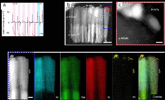 基于前期的工作积累,研究人员从GaN基半导体p-n异质结能带结构设计,MBE外延工艺探索及纳米线形貌调控出发,结合DFT第一性原理理论计算优化及半导体表面金属铂(Pt)纳米颗粒定向修饰,成功构建了基于p-AlGaN/n-GaN异质p-n结的光谱可分辨型光电探测器[Nature Electronics 2021, 4, 645–652]。图1为器件的工作原理示意图。在固定偏压下,该器件在两种不同波长光的照射下展现出独特的光电流极性反转现象:在254nm光照下光电流为负电流,而在365nm光照下光电流为正电流。具体来说,为实现光电流极性反转,特殊设计的顶部 p-AlGaN被用于与底部n-GaN共同吸收波长254 nm的光(图1b)。在254nm光照射下, p-AlGaN和n-GaN中同时产生电子-空穴对(图1a)。其中,p-AlGaN在电解质溶液中向下的表面能带弯曲有利于其中的光生电子向纳米线表面漂移,驱动质子还原反应,而光生空穴则向 p-n 结中的空间电荷区域迁移,与n-GaN产生的光生电子隧穿复合。与此同时,n-GaN中的光生空穴流经外电路,表现出负的光电流信号。而当纳米线暴露在365nm光下时,因p-AlGaN不吸收365nm光照,仅有n-GaN吸收365nm光照后产生光生电子-空穴对。而后,由n-GaN在电解质溶液中呈现的向上表面能带弯曲作为驱动力,促使n-GaN中的光生空穴漂移到纳米线/溶液界面并进行水氧化反应。同时,在表面能带弯曲和p-n结内建电场共同作用下,电子向外电路漂移,被记录为正的光电流。更进一步,理论计算证实:通过在半导体p-AlGaN表面修饰贵金属Pt纳米颗粒可以有效改善氢吸附自由能并提高光电化学光探测过程中的光生载流子分离效率。据此,研究人员利用光化学还原法,成功在纳米线p-AlGaN(000-1)晶面定向修饰Pt纳米颗粒(图2b-d)。最终,在固定偏压下,研究人员成功观察到在不同波长光照下GaN基pn结纳米线中的光电流极性反转现象(图2a)。