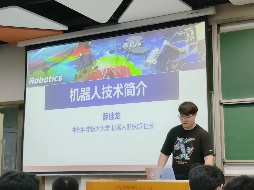 随后,来自机器人俱乐部的薛佳龙学长从什么是机器人、机器人发展史、机器人的研究现状趋势、机器人学的新的发展方向等方面,由浅入深地进行机器人技术的介绍。来自机器人俱乐部的学姐介绍了其社团的概况和RoboGame机器人大赛、RoboMaster机器人大赛、中科大机器人校队(RoboWalker)的简介。