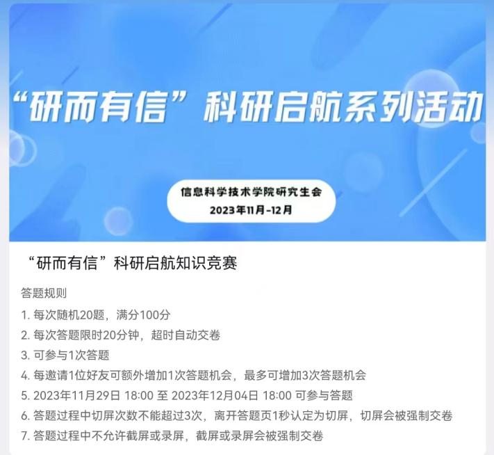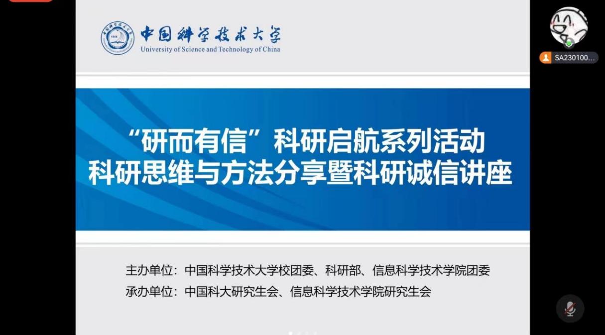 为进一步加强全校同学间的学术交流,提升研究生科研能力及科研诚信意识,规范论文发表和科研成果管理,深入推进科研诚信及学风建设,全面提升科研素养与能力。由中国科学技术大学团委、科研部、信息科学技术开元(中国)团委主办、中国科学技术大学研究生会、信息科学技术开元(中国)研究生会承办的“研而有信”2023科研启航系列活动自11月29日拉开帷幕,于12月4日圆满落幕。