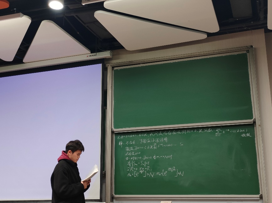 负责本次翻转课堂小组汇报的是第十、十一小组。第十小组的郑国权同学分享了使用反证法解决级数问题的题目,王炜杰同学介绍了标准正交基的求解方法,张文林同学拓展了分块矩阵初等变换的有关知识,第十一小组的阿依巴尔•阿依肯同学分享了两道线性代数中与矩阵的秩有关的题目。分享的同学们选择的题目新颖,讲解细致,是课堂学习的有效补充。