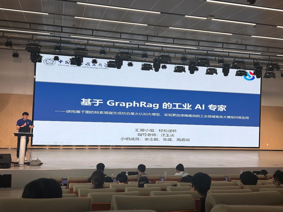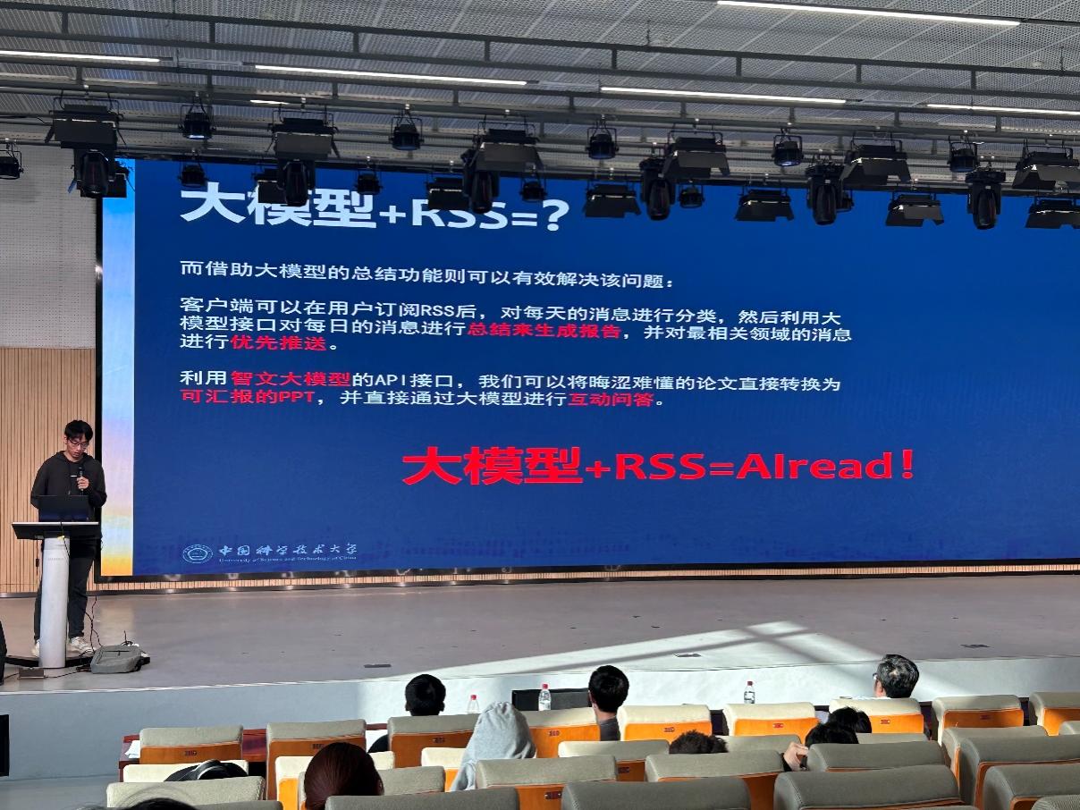 随后的创新应用赛道有八支队伍参赛。“ada-vta”展示了“虚拟助教”。“Airead”展示了“AIread基于大模型的RSS阅读网”。“yxfai”展示了“AIGO-爱购助手”。“龙吟队”展示了“讯飞星火大模型赋能的知识管理和智慧工作Agent”。“轻松逆转”展示了“基于GraphRag的工业AI专家”。“汪汪队”展示了“日程智能规划系统”。“真是组组又队队”展示了“科大·众点评”。“种花人队”展示了“辅助智能花盆机器人”。“科技是人类翱翔天际的唯一羽翼”,各组同学们都凭出色的设计创新想象力与执行力呈现出精彩纷呈的作品。