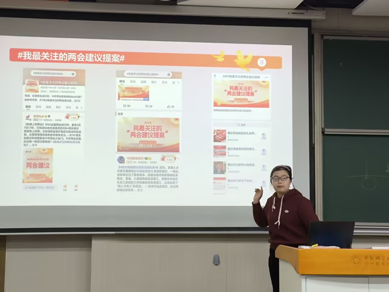 在讲解两会内容的同时,主持人还结合当前的社会热点,分享了有关网络活动。其中,她重点介绍了微博上的“我最关注的两会提案”活动:在两会期间,大家都可以在活动中了解两会相关政策,参与相关话题讨论,还可以投票选出自己最关注的两会提案。主持人鼓励同学们积极参与到活动当中,了解有关提案与政策,为两会建言献策。