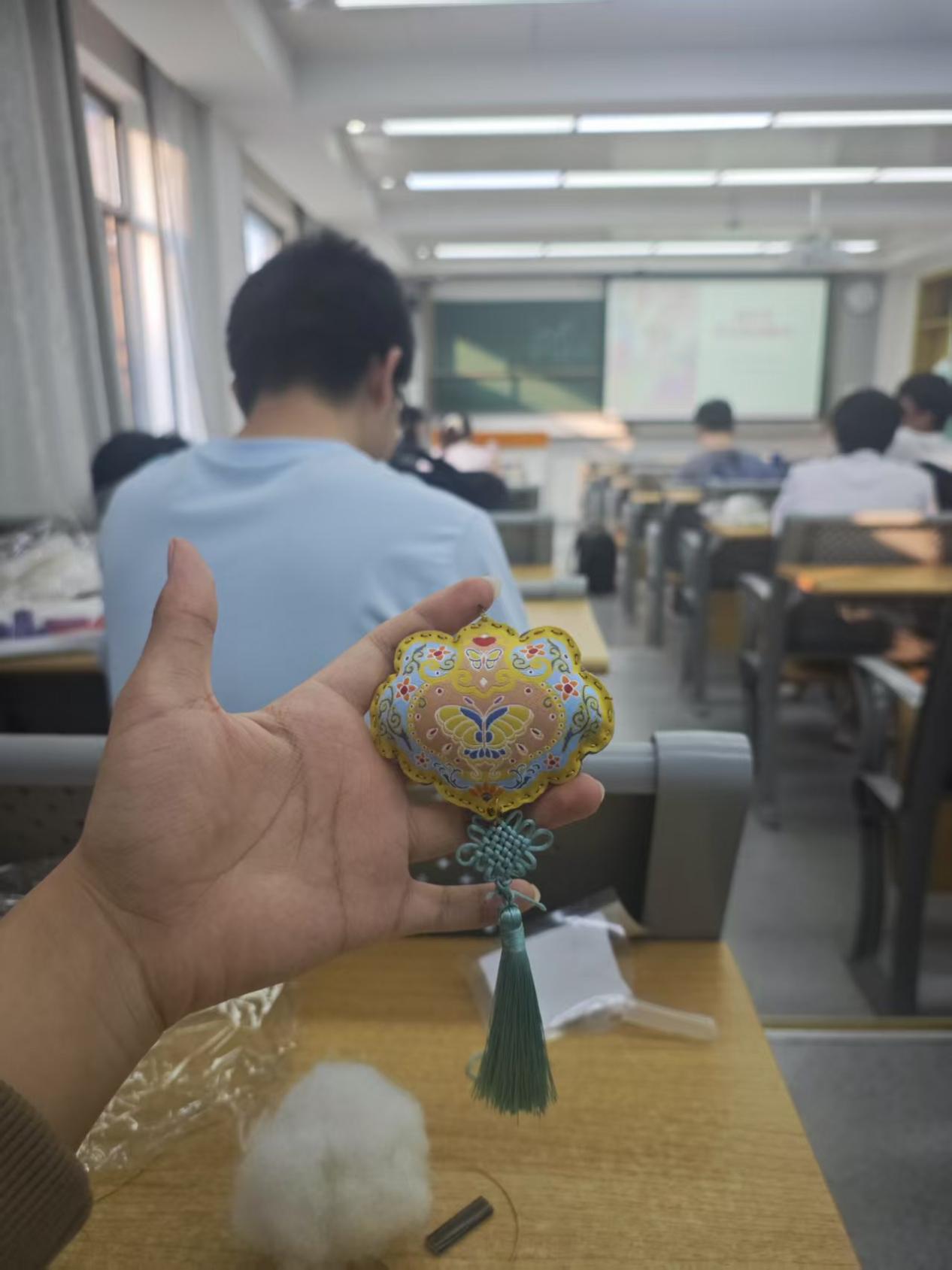 活动在西区3A107教室举行。活动开始之前,生活委员邹昊鹏将精心整理的《香囊制作教程》发送至班级群,涵盖了缝制技巧、药材选择及文化寓意等内容,为活动预热。活动现场,同学们纷纷拿起针线,跟随着教程开始了一针一线的缝制。穿针引线的动作虽然略显生涩,但却饱含专注。同学们先将生活委员事先准备好的两片香囊外包布料沿着边缘用针线紧密缝合,待缝制四分之三左右,再将香料以及棉花填充进香囊包中,随后将留下的小口缝合起来,这样香囊的主体部分就制作完成了。